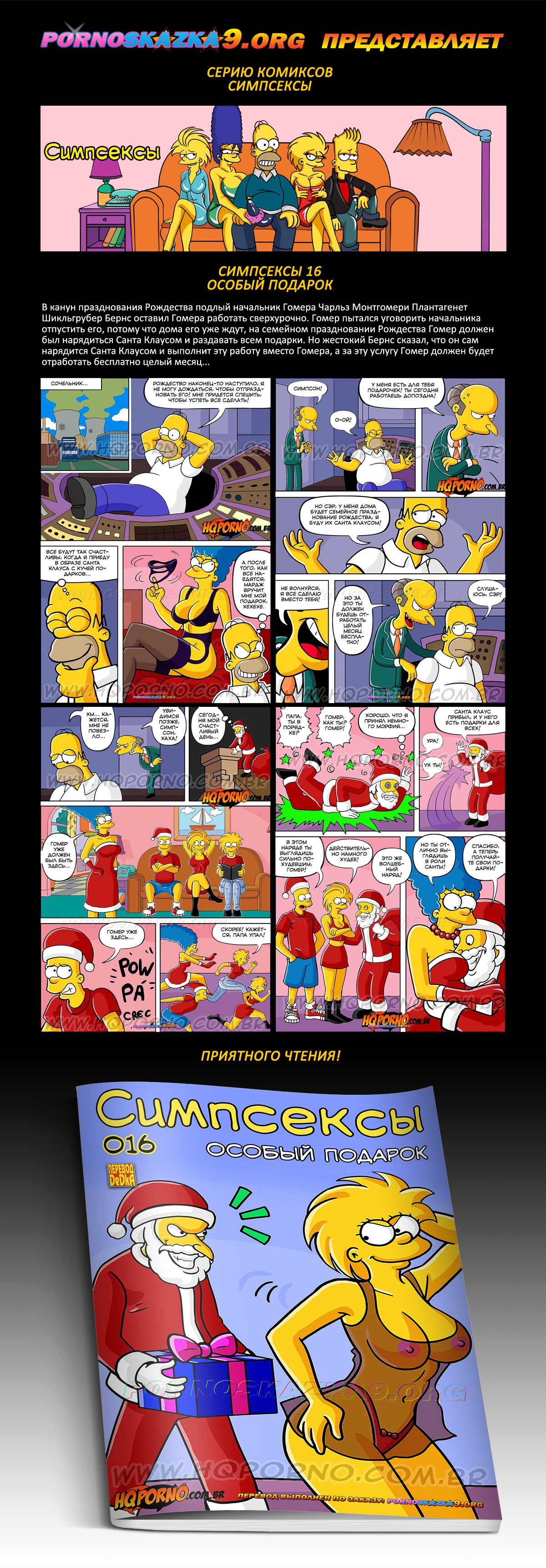 Порно комикс Симпсексы. Часть 16. Особый подарок. В канун празднования Рождества подлый начальник Гомера Чарльз Монтгомери Плантагенет Шикльгрубер Бернс оставил Гомера работать сверхурочно. Гомер пытался уговорить начальника отпустить его, потому что дома его уже ждут, на семейном праздновании Рождества Гомер должен был нарядиться Санта Клаусом и раздавать всем подарки. Но жестокий Бернс сказал, что он сам нарядится Санта Клаусом и выполнит эту работу вместо Гомера, а за эту услугу Гомер должен будет отработать бесплатно целый месяц…